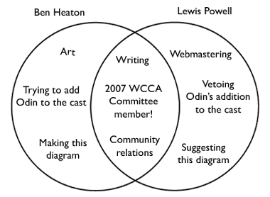 Sometimes people (actual people, not fictional ones like Ben talks about in his notes), ask us who does what on the comic. So, I came up with an idea which Ben executed, namely the creation of a diagram of our responsibilities.