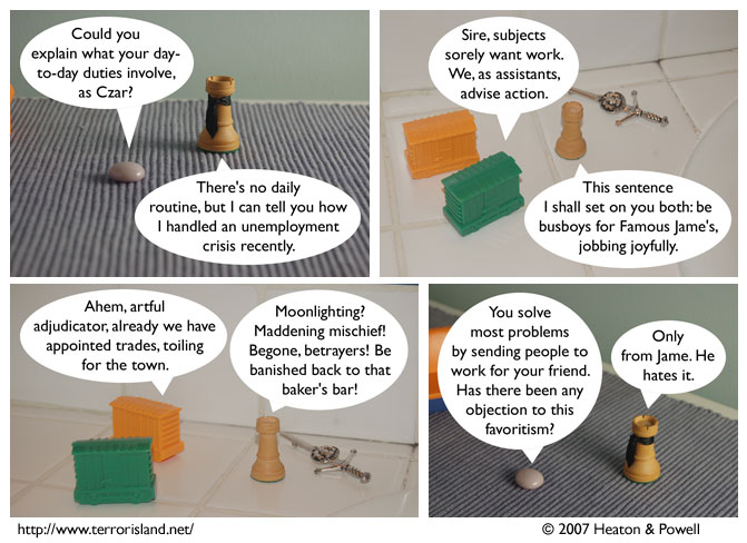 Stephen assumes unemployment problems are a matter of the distribution of jobs among the employed, rather than an increase in the number of employed people. This puts him at both ends of the standard political continuum, and today's strip was supposed to serve as political commentary to that effect.